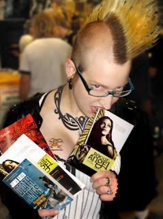 These kids came back to our booth every day hoping the Rogue Angel books would ship in. We made it up to them by giving them an author-signed copy of Luna's Poison Study by Maria V. Snyder. This photo was taken two seconds before the brother and sister on the left started wrestling for it.